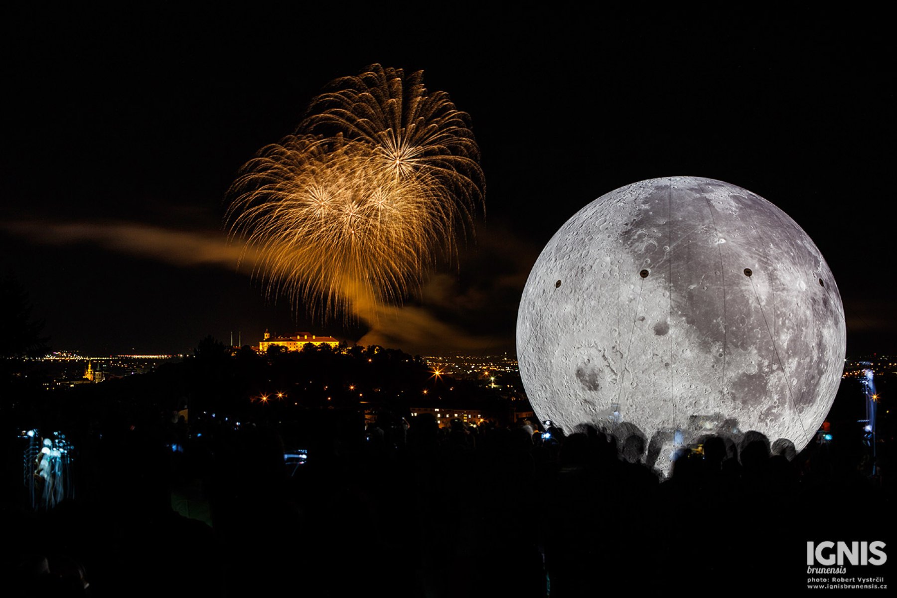 Brno, Špilberk, Kraví hora - Na nočním nebi nad hradem Špilberk zazářily ve čtvrtek večer sedmikrásky. Stovky lidí sledovaly úvodní ohňostroj Ignis Brunensis i z Kraví hory, kde zářil i populární desetimetrový model Měsíce, takzvaný lunalón. Pro diváky představoval fotogenickou atrakci.