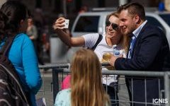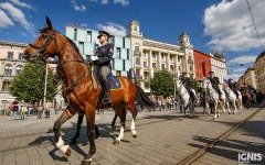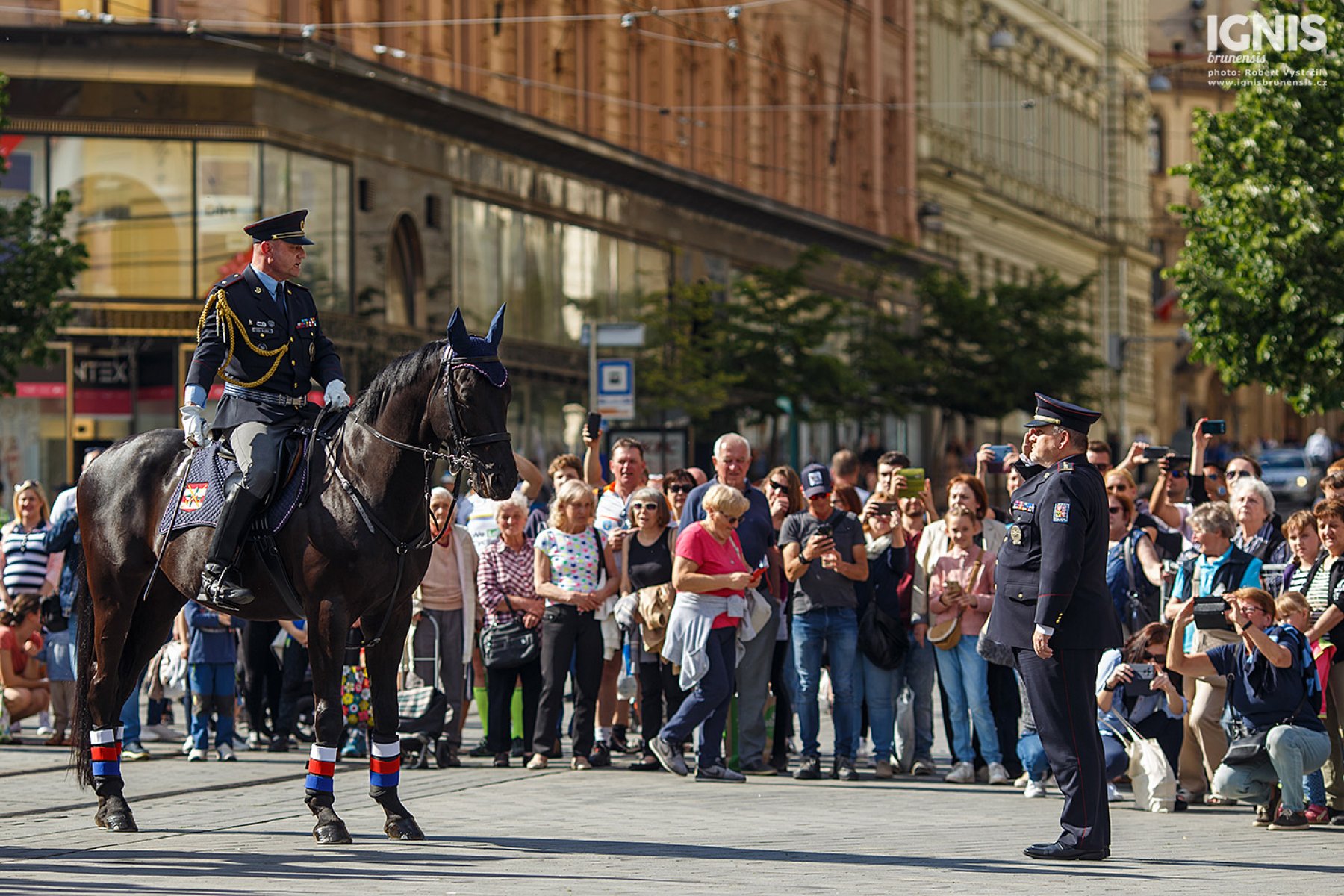 Fotoreportáž z defilé Mezinárodního policejního mistrovství v jezdectví na náměstí Svobody.