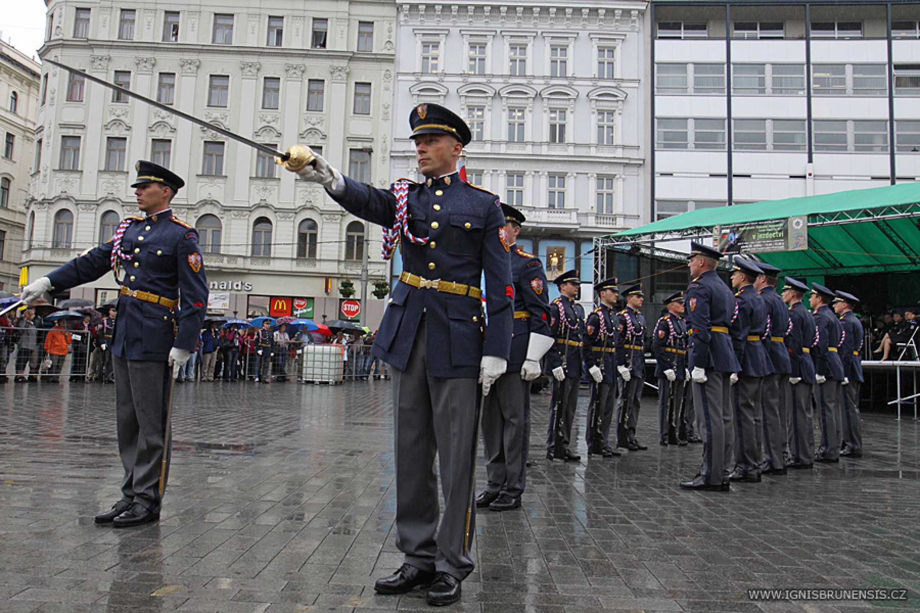 Brno-stred – Nad Brnom sa zaťahujú mraky, z ktorých padá hustý dážď. Na námestí Slobody ale aj tak stoja vytrvalci s dáždnikmi alebo v pršiplášťoch, ktorí si prišli vypočuť Hudbu Hradnej stráže a Polície Českej republiky. Zároveň si prišli pozrieť pochod Hradnej stráže.